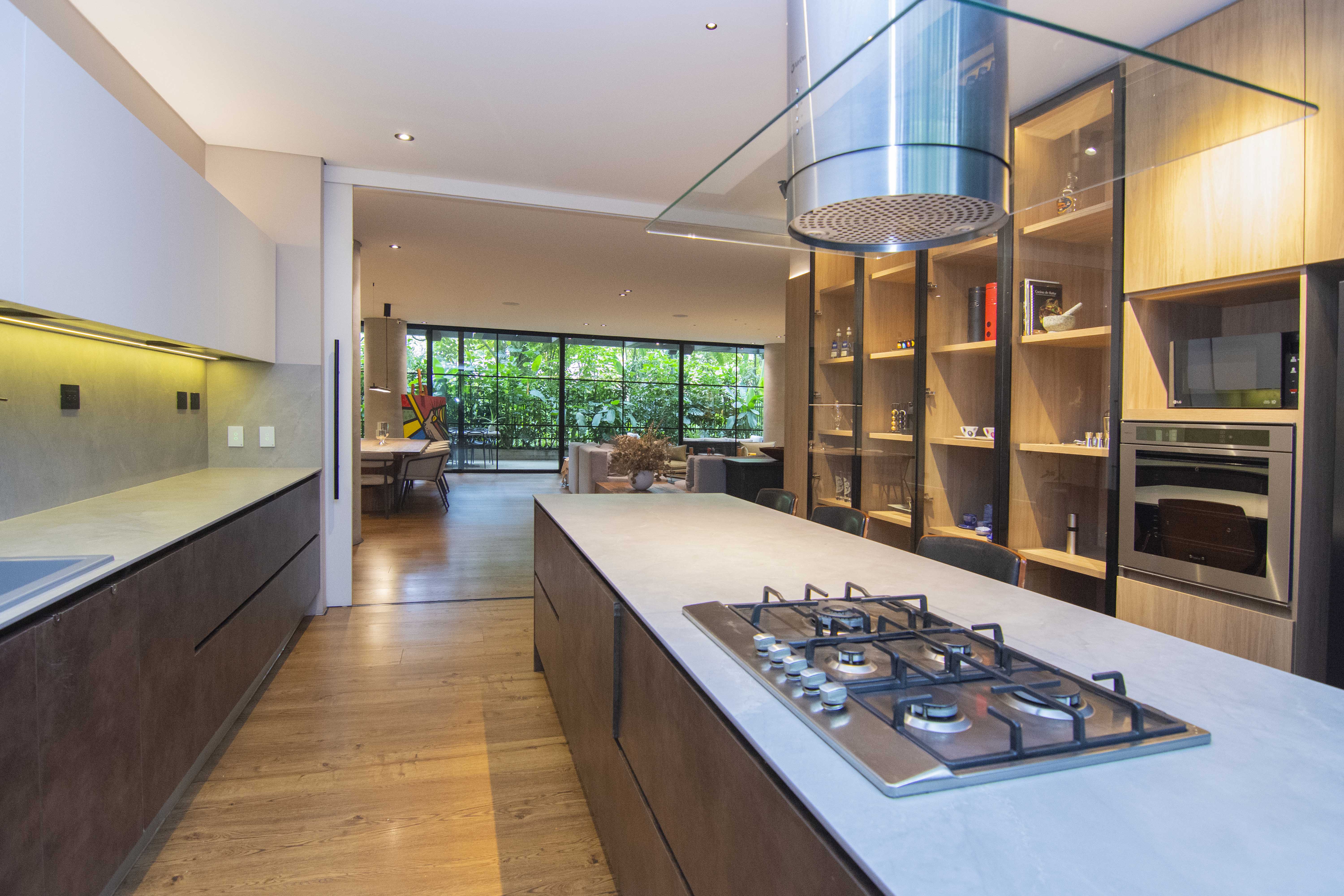 Upon entering, you’re welcomed by a spacious social area filled with natural light, thanks to large floor-to-ceiling windows that open directly onto the terrace. This outdoor extension becomes a true highlight of the home — ideal for entertaining, relaxing, or simply enjoying the surrounding greenery. The kitchen is designed with flexibility in mind: it integrates beautifully with the living area but can also be closed off for added privacy when needed.