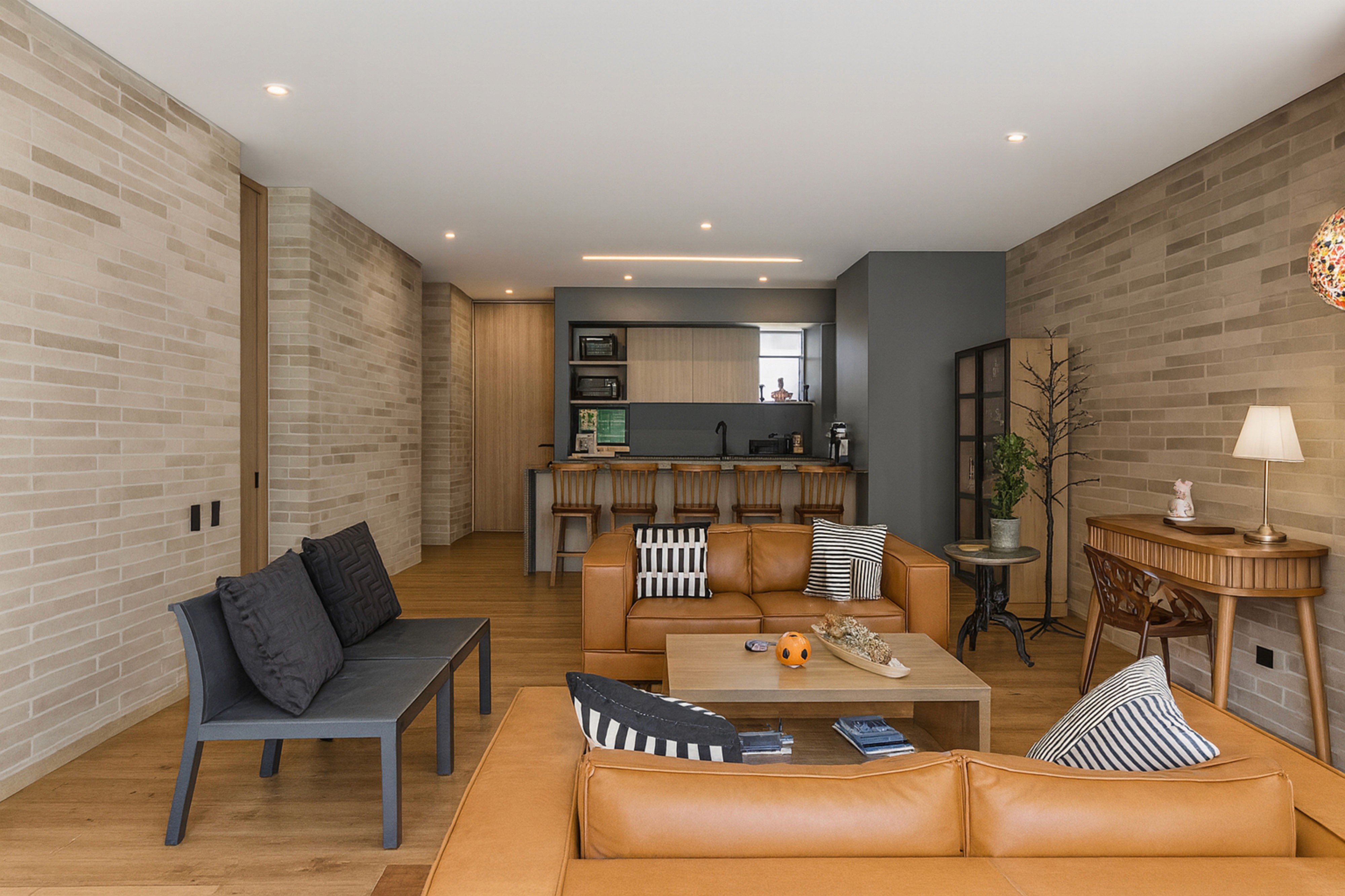 With 112 m² of thoughtfully designed space, the apartment blends modern finishes with warm, character-filled details. From the moment you walk in, you’re greeted by an expansive social area filled with natural light, thanks to floor-to-ceiling windows that frame the surrounding vegetation and create a seamless connection with the outdoors.