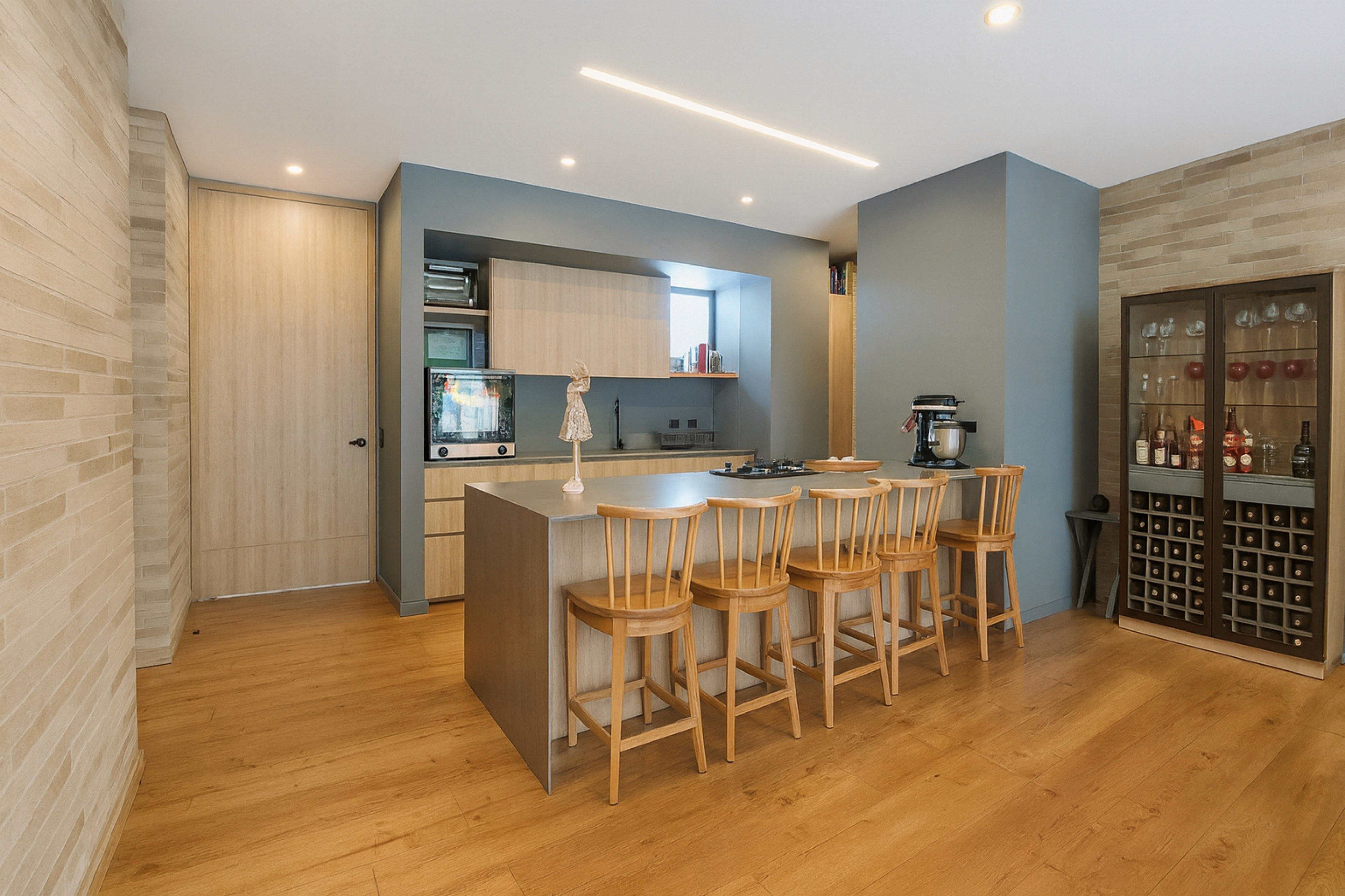 The open-concept kitchen integrates effortlessly into the living space, making it ideal for both everyday living and hosting. High ceilings with exposed coffers add volume and architectural interest, while brick accent walls and wooden floors bring warmth and texture throughout the home.
